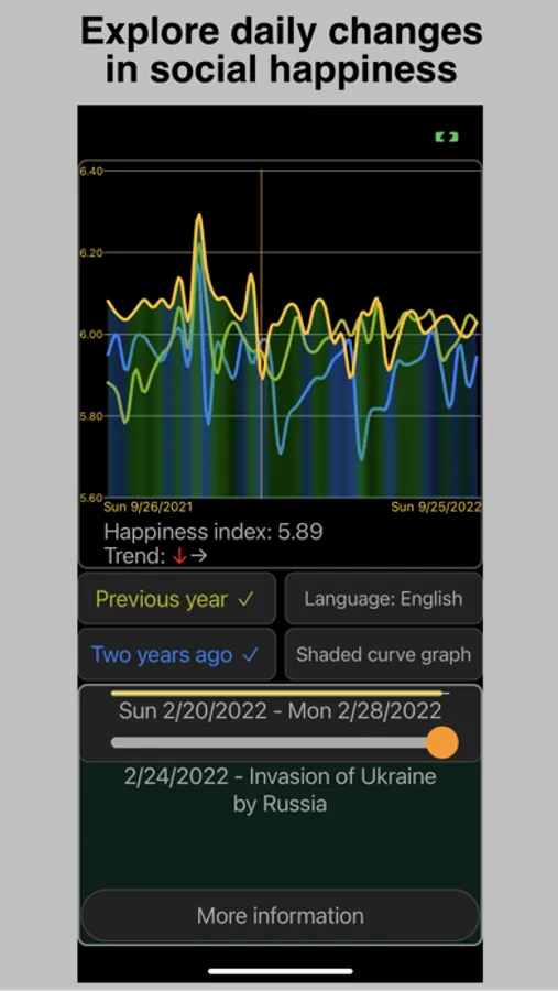 The app supports Watch complications and iPhone widgets including the new iOS 16 Lock Screen widgets. Data for complications and widgets is automatically updated in the background, so there is no need to open or manually refresh the app to see the latest data. Hedonometer.org's data is updated once a day. The complications and widgets always show the most recent data using whatever time range scale you’ve set. The information displayed will be the most recent happiness index, plus the trends over the most recent two days…sort of like a social happiness barometer. Because Watch complications and Lock Screen widgets may be monochrome only, the app uses line weights and styling for displaying each of the three years - a thick line for most recent, a thin solid line for a year ago, and a dashed line for two years ago.