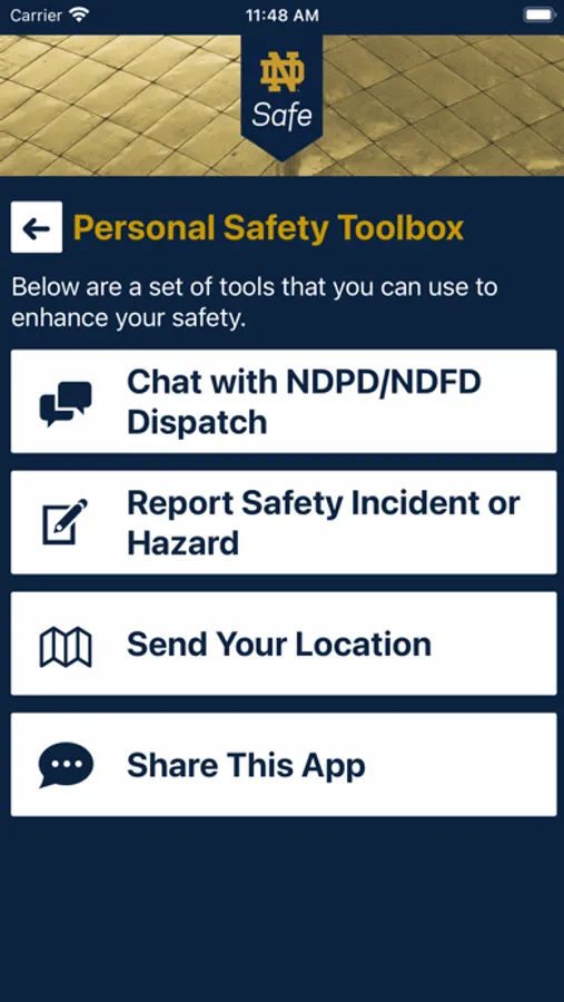 ND Safe is the official safety app of University of Notre Dame. It is the only app that integrates with University of Notre Dame's safety and security systems. NDPD has worked to develop a unique app that provides students, faculty and staff with added safety on the University of Notre Dame campus. The app will send you important safety alerts and provide instant access to campus safety resources.