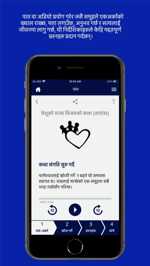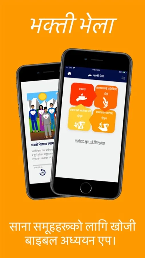 भक्ति भेलामा, बाइबलका पदहरू समावेश गर्ने पाठ र अडियोको सहयोगमा, तपाईंको सानो समूहले येशूलाई सत्य रुपमा पछ्याउदै जीवनको लागि साँचो, सरल र फेरि नयाँ भएर जिउने मार्गहरू अनुभव गर्न सघाउनेछ । वास्तवमा, जब तपाईं एकअर्काको ख्याल गर्नुहुन्छ, परमेश्वरका सिद्धान्तहरू र अभ्यासहरू पत्ता लगाउनुहुन्छ, तपाईंले पत्ता लगाउनु भएको कुरालाई व्यवहारमा उतार्नुहोस्, परमेश्वरको उपस्थितिको अनुभव गर्नुहोस् र अरूलाई पनि त्यो अनुभब बाँड्नुहोस् - तपाईंले अन्य मानिसहरूलाई समूह बनाउन र उनीहरूको घरमै भएर परमेश्वरमा हुर्कन मद्दत गर्न सक्नुहुन्छ।