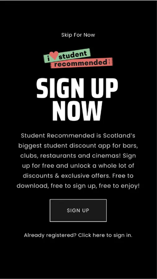 Student Recommended is Scotland’s biggest student discount app for bars, clubs, restaurants and cinemas! Sign up for free and unlock a whole lot of discounts & exclusive offers. Free to download, free to sign up, free to enjoy!