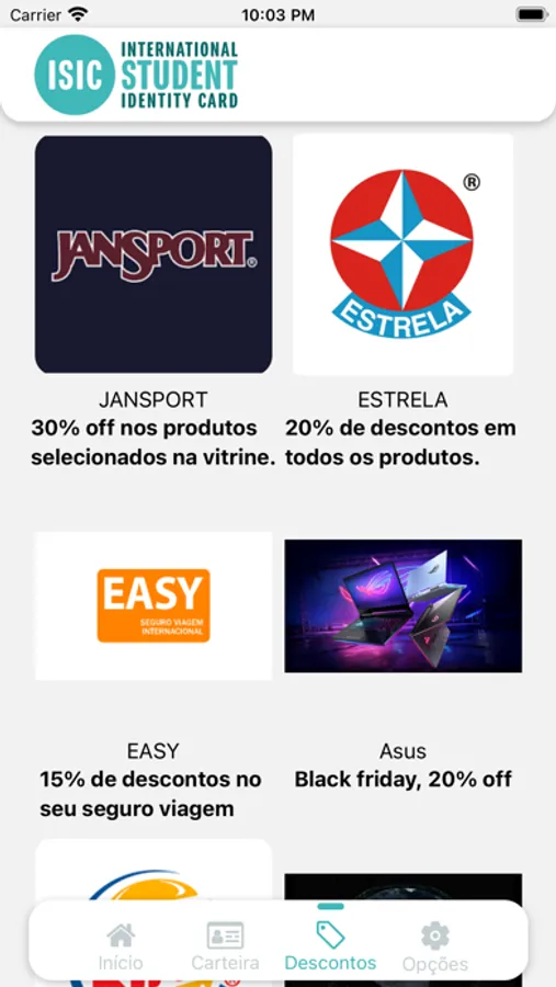 Busque e visualize milhares de benefícios e descontos disponíveis para portadores da carteira ISIC no mundo todo. Veja ainda quais os benefícios e descontos estão disponíveis para você com a sua Jovem Card (IYTC) e Carteira do Professor (ITIC)!