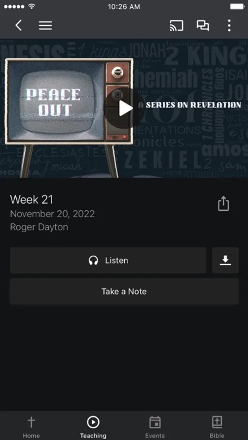 This app will help you stay connected with the day-to-day life of our church. With this app you can: watch or listen to past messages; stay up to date with push notifications; share your favorite messages via Facebook, or email; and download messages for offline listening.