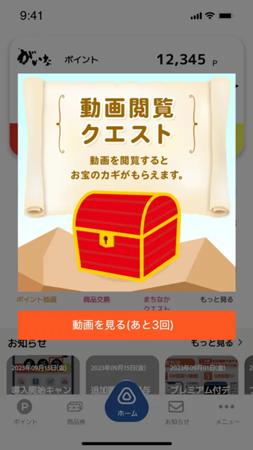 動画閲覧クエストやまちなかクエストで動画を閲覧するともらえるカギです。
