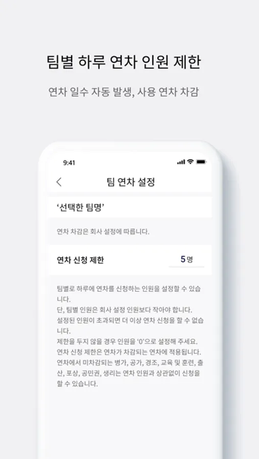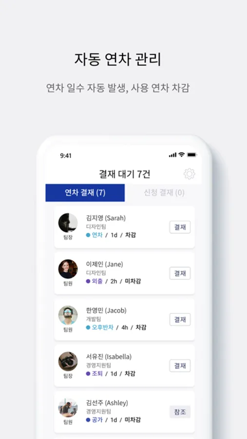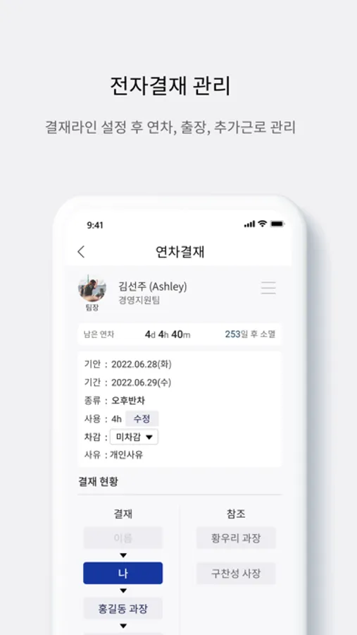 2. 근로자가 연차신청을 앱에서 전자결재로 신청, 결재완료 후 연차 차감