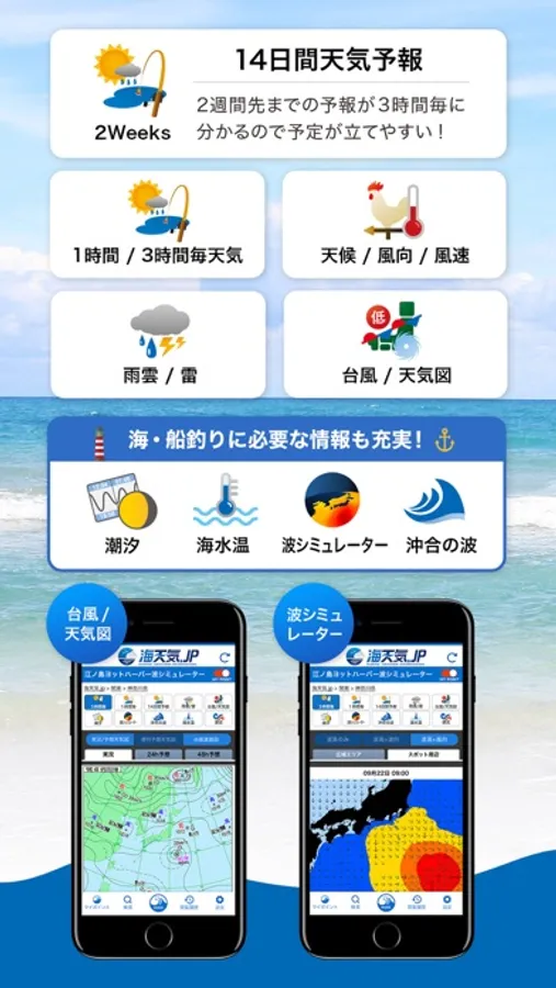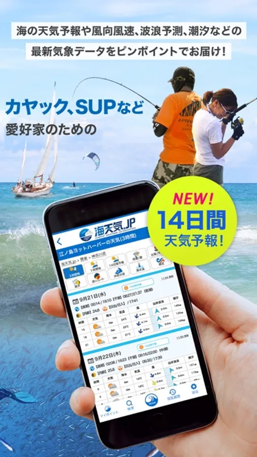 14日先までの天気予報を、3時間毎の時系列で提供。マリンレジャー計画に役立つ天気の流れの把握に!