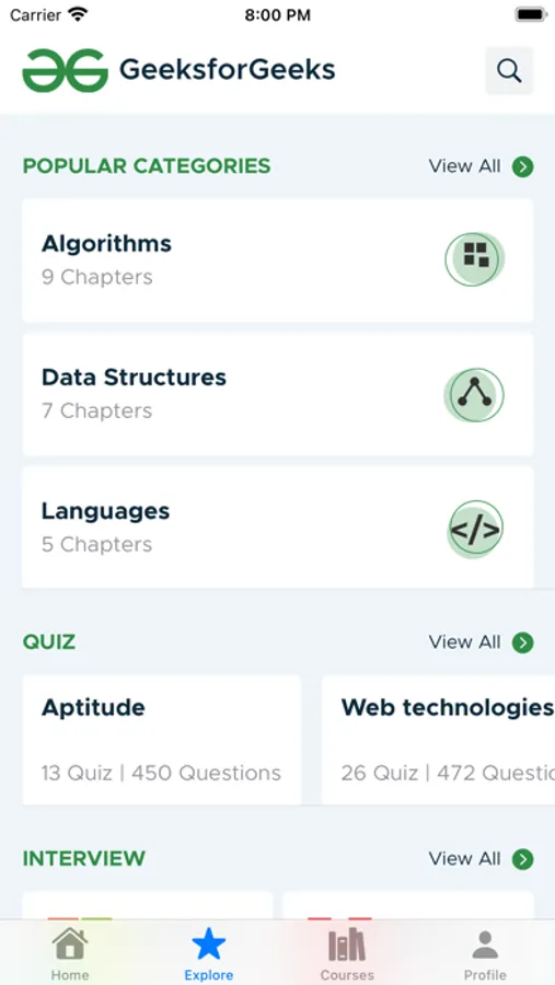 GeeksforGeeks is a one-stop destination for programmers. The app features 20000+ Programming Questions, 40,000+ Articles, and interview experiences of top companies such as Google, Amazon, Microsoft, Samsung, Facebook, Adobe, Flipkart, etc. Join the community of over 1 million geeks who are mastering new skills in programming languages like C, C++, Java, Python, PHP, C#, JavaScript etc. For exam aspirants preparing for GATE, UGC NET, ISRO there are previous year papers and aptitude questions. Whether you are a student looking to start your career or an experienced professional looking to switch jobs, GeeksforGeeks has your back.