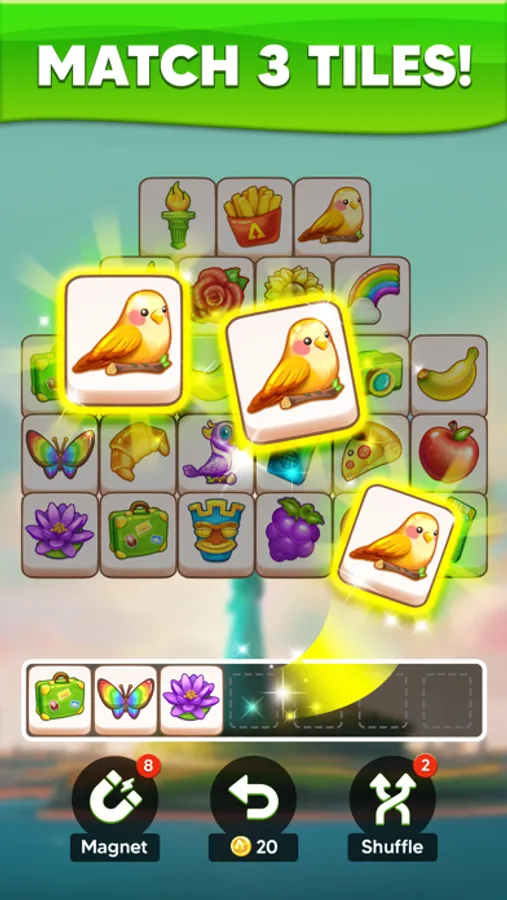 Tile Home Makeover aims to crush all the tiles to solve many challenging levels. Tap and match 3 tiles to drop them in the blank bar, clear the board, and avoid running out of slots, or you will lose the game. Let's find and connect all the hidden matching tiles and become an expert level by level!