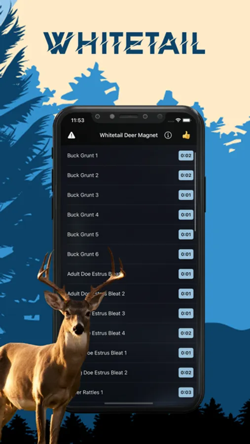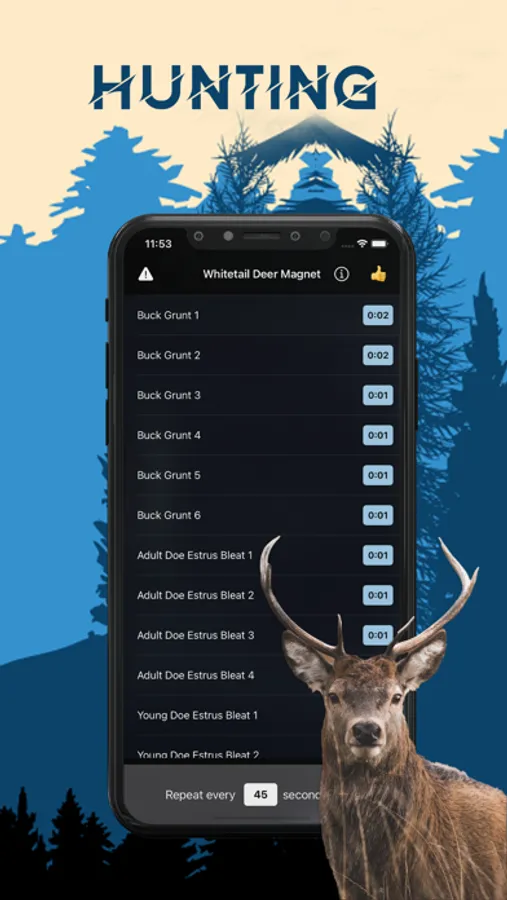 No longer do you need drag along bulky calls or the even more cumbersome set of antlers to bang together. Now you can prepare whitetail deer calls for hunt and become a deer calls pro for whitetail buck hunting. With this deer hunting calls app you can simply select from multiple deer calling sounds to attract deer to your hunting stand with this deer hunting apps sounds