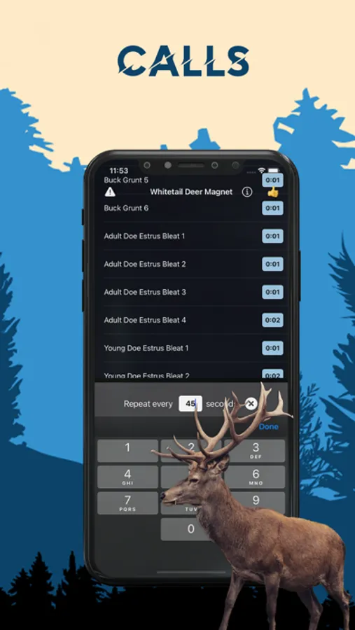 You can play the sounds individually and set them to repeat after the amount of seconds that you desire. Or you can manually tap different sounds create a deadly combination of calls that will work perfectly for the whitetail deer you are hunting.
