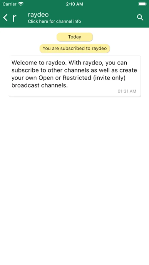raydeo is a one way downstream message broadcast solution, where users can subscribe to one or more channels that users create and run. Channels can be of 2 types