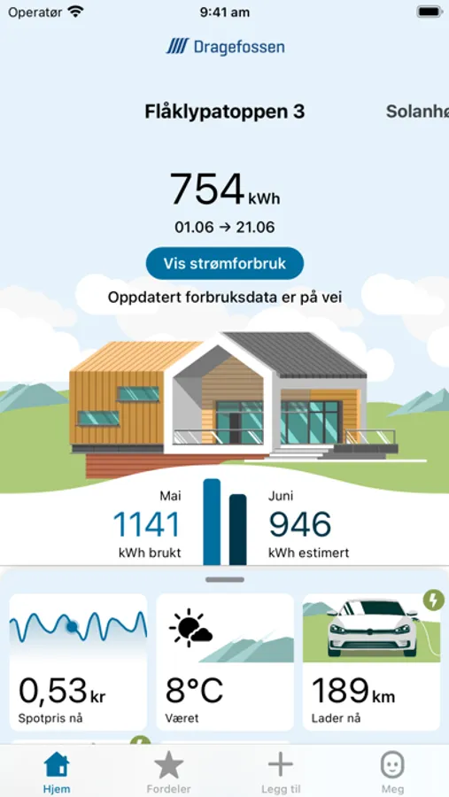 Last ned Dragefossen-appen og få kontroll og oversikt over ditt strømforbruk. Med appen kan du lade elbilen når strømmen er billigst, koble opp smarte produkter og se hvilke utslag årstid, vær, helger og ferier har på strømforbruket ditt.