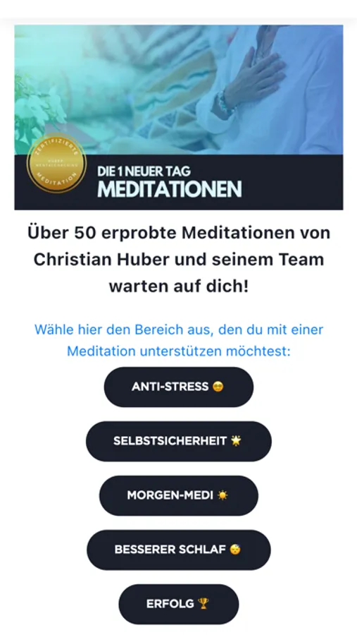 - Sei mehr mit dir selbst und deiner inneren Kraft verbunden, fühle dich ruhig und gelassen durch 50 zertifizierte Meditationen, Traumreisen und Affirmationen von Christian Huber und seinem Team aus unserer Mediathek