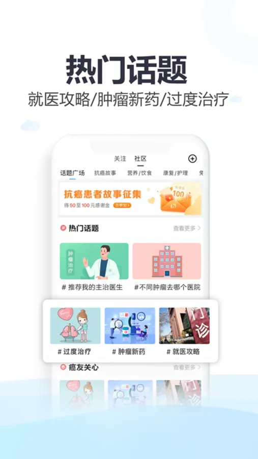 【社区/热门话题】为肿瘤患者提供专属交流平台,可以快速找到病情相似的病友,分享治疗经验、饮食禁忌和生活日常等。