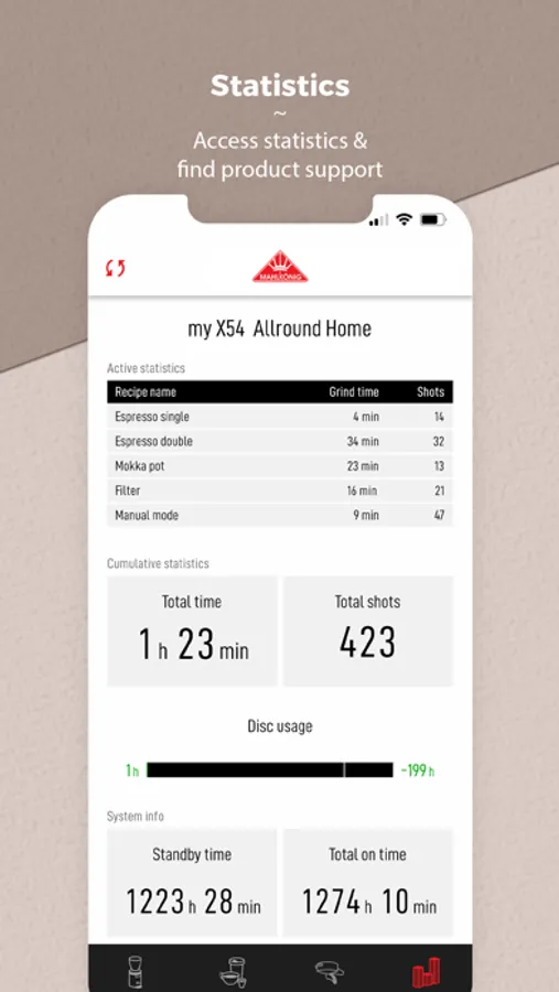 - Statistics of your X54 Allround Home Grinder letting you know the number of shots you pull, the usage of your grinders burrs, and many more statistics around your usage