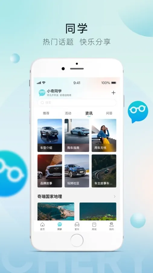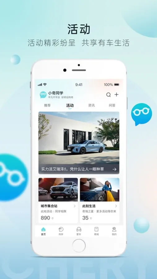 本应用是奇瑞汽车推出的一站式汽车服务APP,核心功能以车会友参加社区交流,并集合车主资源,建设共创小奇社团、小奇同学会;奇瑞汽车提供车辆展示、小奇服务社、小奇优选等服务。