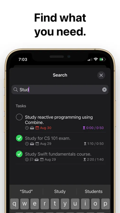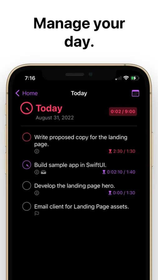 Estimate the time you expect a task to take by changing its difficulty. Keep track of how well you’re performing against your goal.