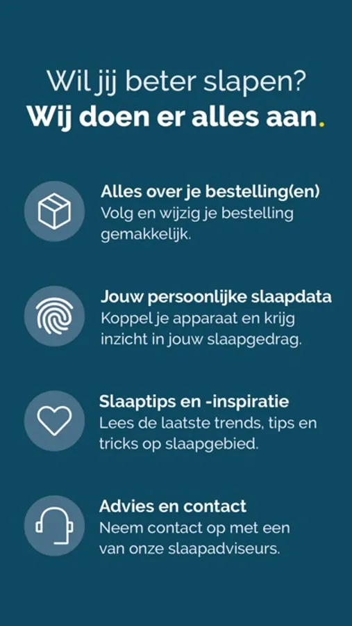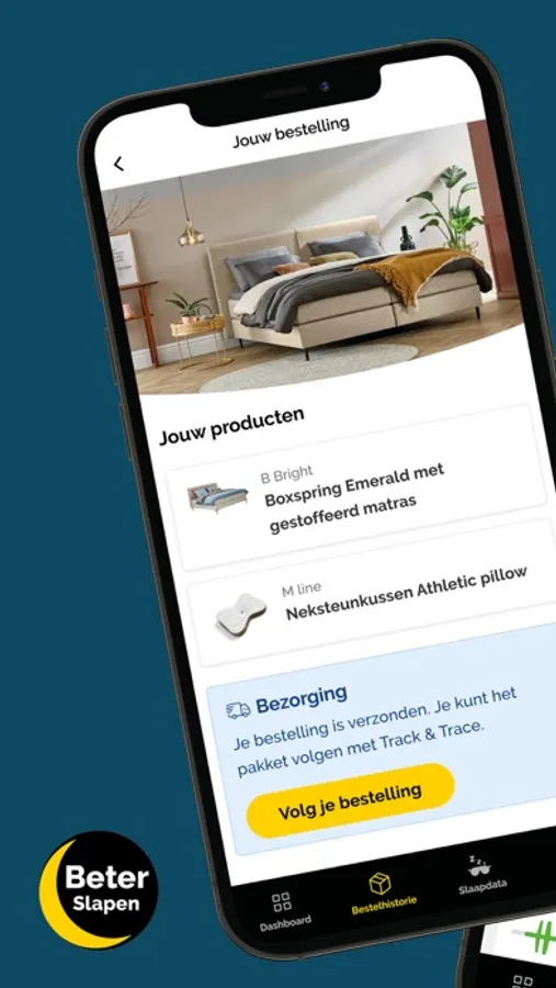 De Beter Slapen App geeft je naast slaapinzicht en -advies ook een compleet overzicht van je bestellingen. Wat is de status van je bestelling? Bekijk je bestelhistorie, check je bezorgdatum of de volgorde van het complete bestelproces. Wil je iets wijzigen in je bestelling, je bezorgadres of bezorgdatum? Je regelt het eenvoudig met de Beter Slapen App.