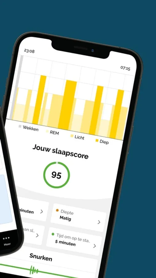 Snurk ik? Hoe lang duurt het gemiddeld voordat ik in slaap val? Hoeveel tijd ben ik per nacht wakker? Hoe lang duren mijn slaapfasen (lichte, diepe of REM-slaap). Voorbeelden van vragen waar de Beter Slapen App je met de professionele metingen van jouw Withings Sleep Analyzer antwoord op geeft. Zodra je wakker bent, bekijk je je gegevens in de app. De gegevens worden geanalyseerd en geven jouw nacht een slaapscore. Bekijk de gegevens in het dashboard en zie in één oogopslag welke nachten je minder goed geslapen hebt en krijg inzicht in je slaappatroon. Ontdek jouw aandachtspunten, bekijk de slaaptips, pas ze toe en slaap beter. Je slaapscore wordt onder andere bepaald door de volgende inzichten die de Beter Slapen app je biedt: