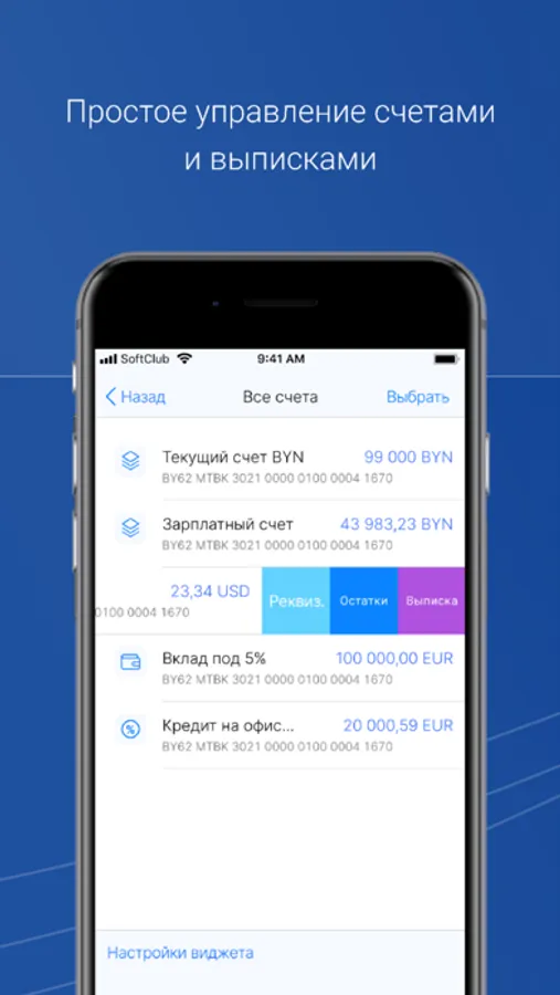 - формирование выписки по счету в разных форматах, печать выписки и отправка выписки на e-mail
