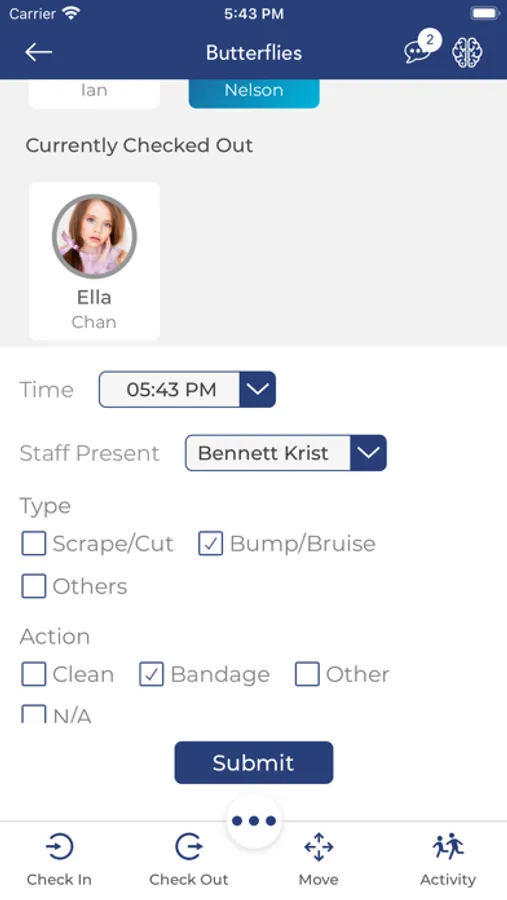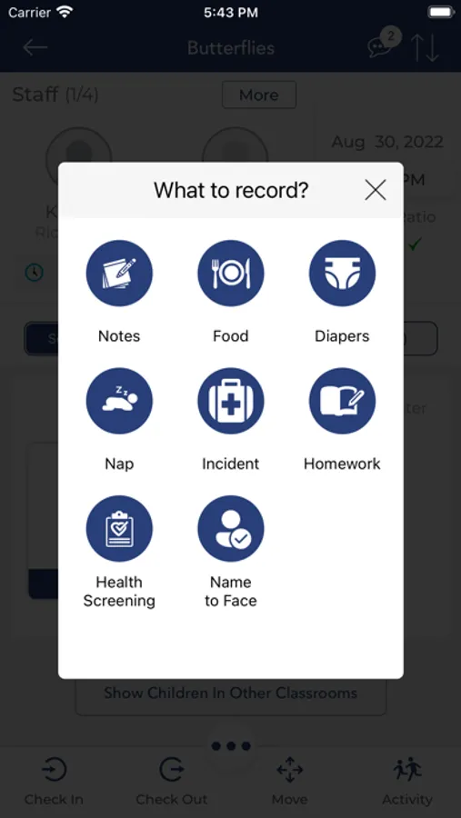 • Post activities like Food, Diaper, Nap, Homework, Activity, Notes, Incident and Name to Face by selecting the children