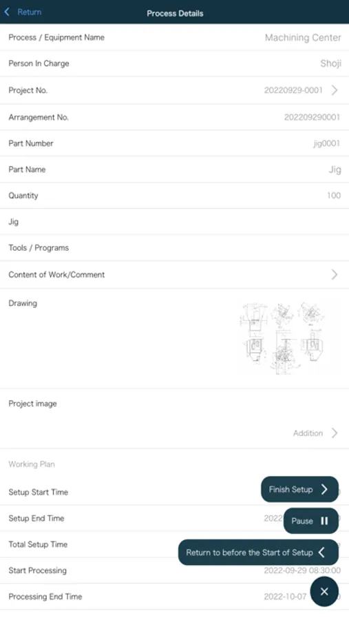 You can immediately register the start, end, and suspension of both setup and manufacturing processes to great details.