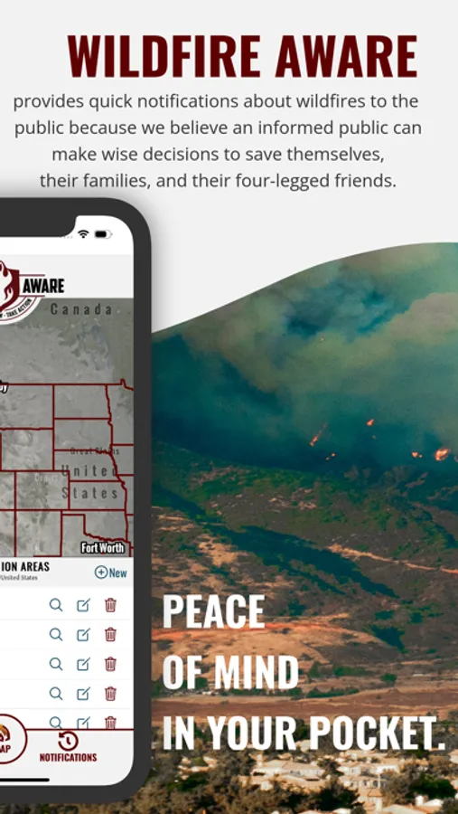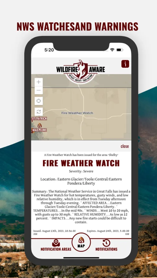 As a subscriber, Wildfire Aware provides near real-time alerts for Wildfires in the areas you care about. With Fire Weather information built into the alerts, know the Temperature, Winds, and Relative Humidity immediately when a fire starts. As fire agencies provide authoritative updates, we deliver those directly to your phone. As the National Weather Service (NWS) issued watches and warnings related to Wildfire, we push notifications directly to your phone.
