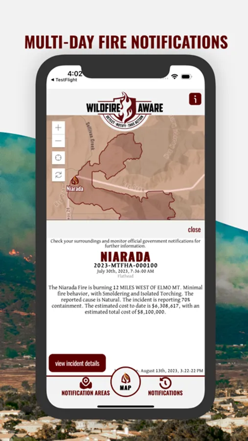 As fires burn for days or months, Wildfire Aware not only provides you notifications about perimeter updates but also provides authoritative supplemental agency data as well. Letting you know where the fire is. We source information from NIFC, IRWIN, InciWeb, CAL FIRE, US Forest Service (USFS), Bureau of Land Management (BLM), Department on Interior (DOI), and Texas A&M Forest Service, to name a few.