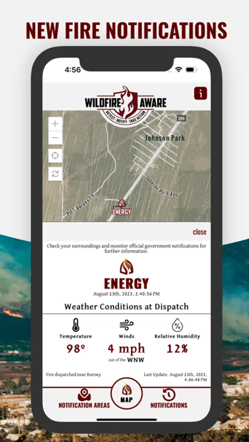 As a Premium feature of Wildfire Aware, we provide near-real-time notifications of wildfires in areas you care about. When a fire is dispatched by a NIFC participating agency anywhere in the United States, you are notified as quickly as possible. We provide wildfire alerts quickly and supplement that with the most current Fire Weather information, providing Temperature, Wind Speed Direction, and Relative Humidity at the time of the fire.