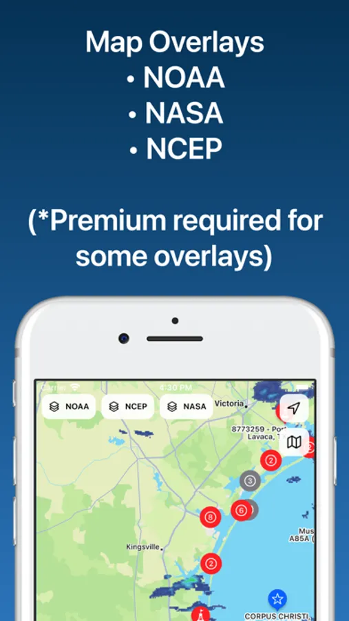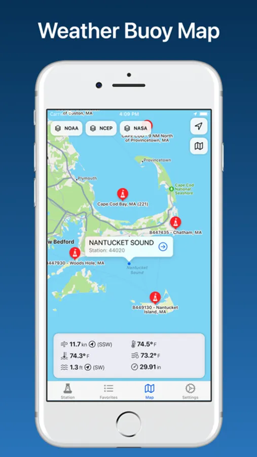 • Maps - Find buoy stations on an interactive map, including NOAA, NCEP, & NASA overlays. Overlays are subject to change, but currently include base radar reflectivity, sea surface temperature, nautical charts, chlorophyll concentration, and more. (Some overlays require Premium)