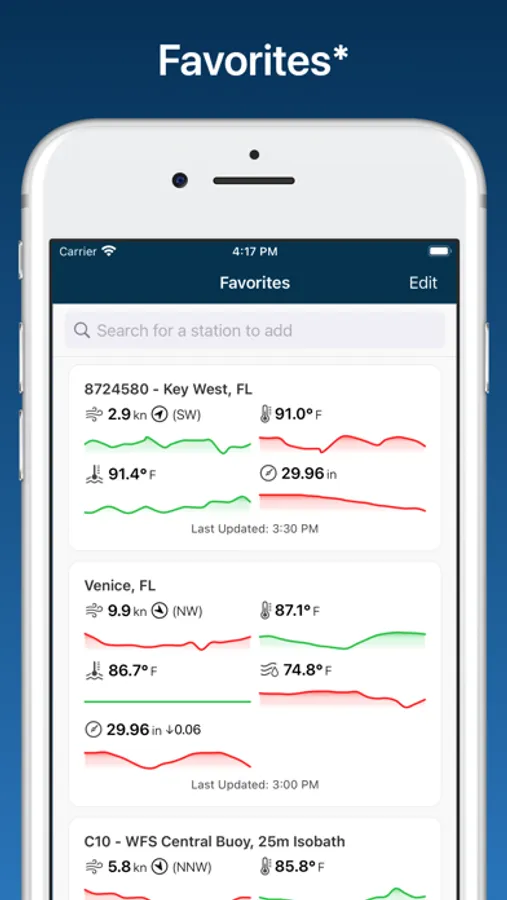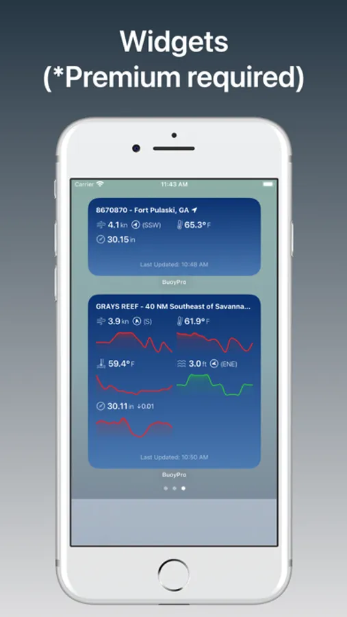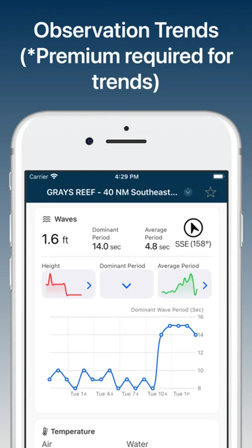 • Favorites - Conveniently track observations at the buoy stations you care about most. With Premium, you also get a tab/sheet that shows buoy observations for all your favorites at once.