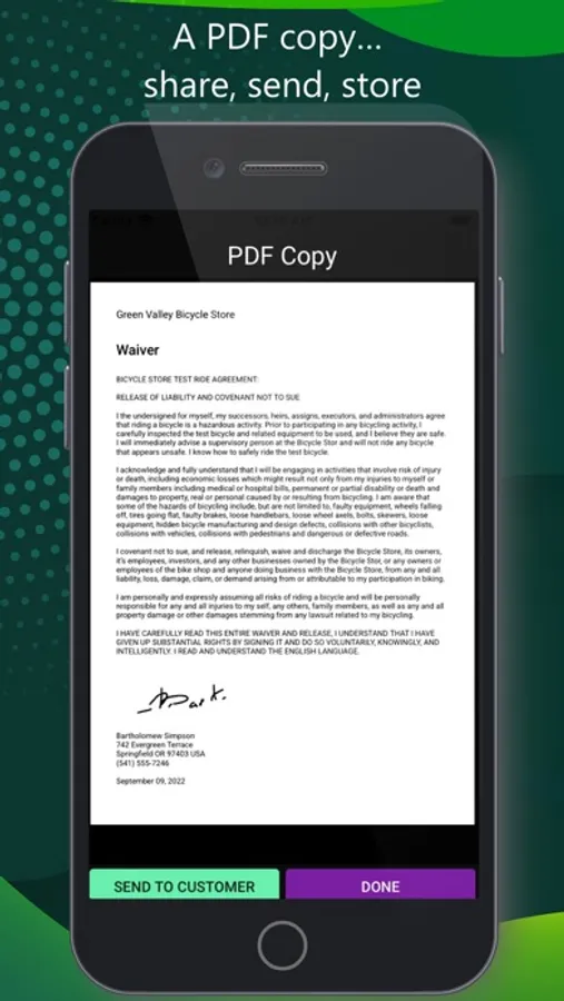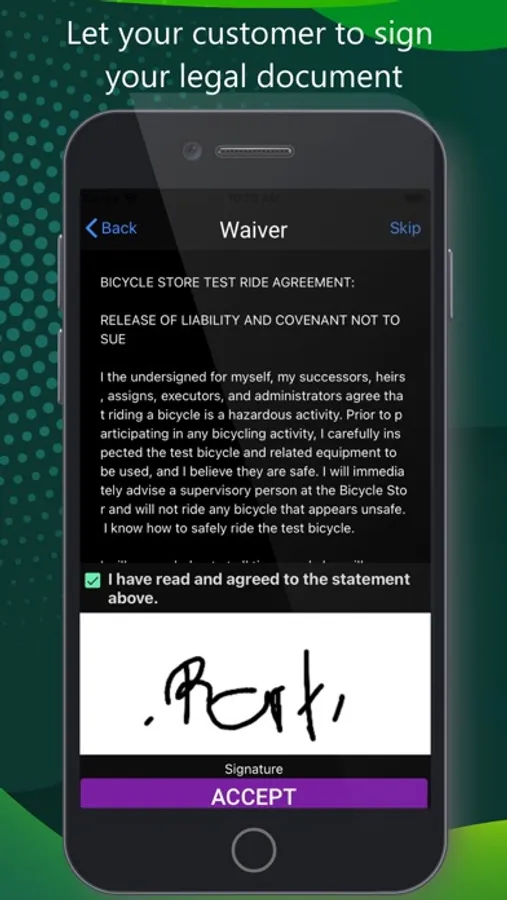 GV Waiver will use the device camera to read customer's name and address from driver's license barcode. No misspelling. No extra devices. Your customers just only need to give their phone number and email and then sign a legal document on the device.