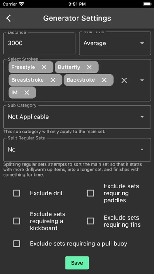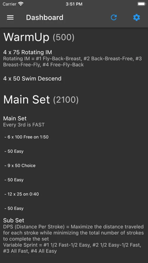 Create swim workouts at the press of a button. Setup to create a unique workout for you with options such as distance, stroke, and level of difficulty.
