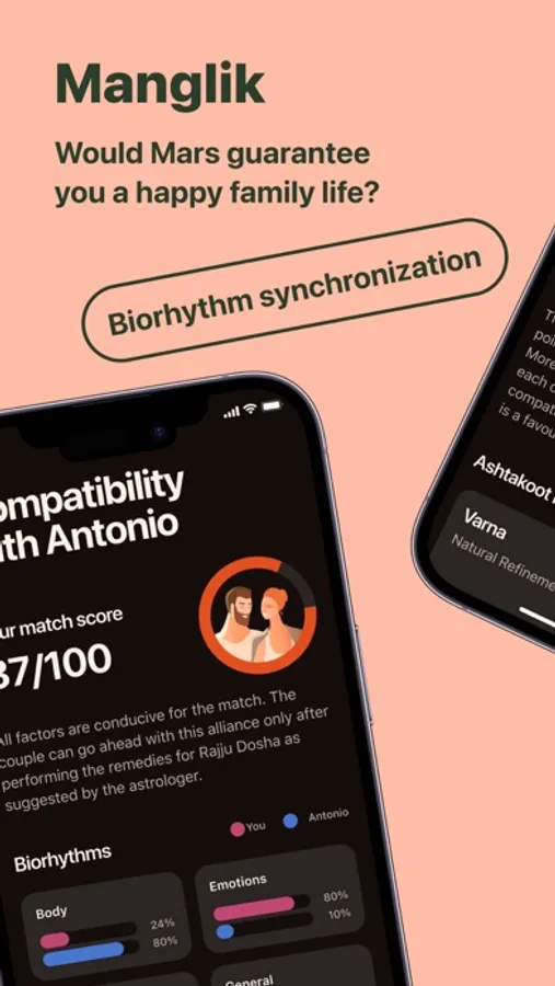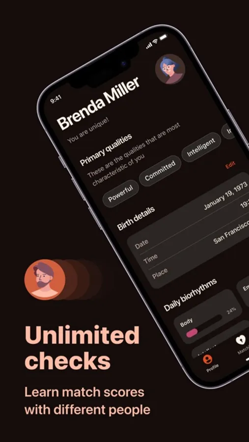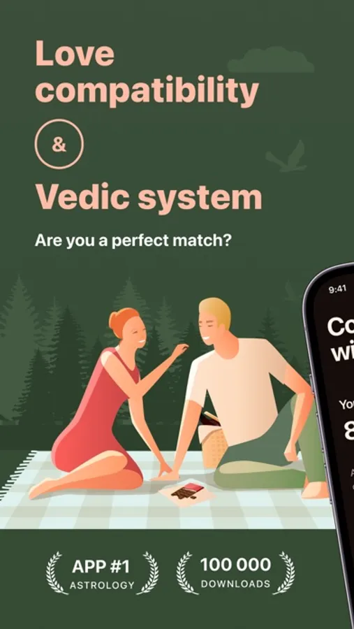 All you need to do to discover the partner compatibility is to enter your name and birth details, and then provide the same information about your partner. After that, the app runs the compatibility check to calculate your match score, taking into account numerous factors, such as horoscope peculiarities, mutual attraction, friendship, temperament, emotional levels, spiritual development, health, genes, financial prosperity, etc. The app identifies how many parameters both people have in common. As a result, the app gives a score between 0 to 100%. The higher the percentage, the better the match.