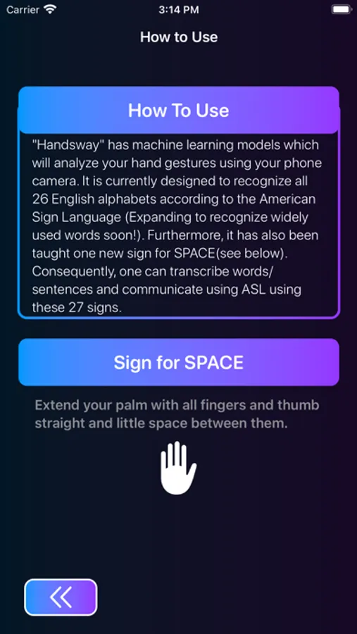 Handsway is a one-of-a-kind, non-profit, completely free application (and will always remain free) which can be used to translate ASL(American Sign Language) to text and speech in real time using your in built camera! It was developed to make the world more accessible and break communication barriers.