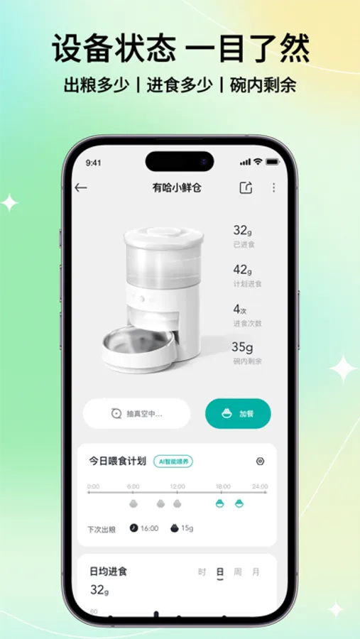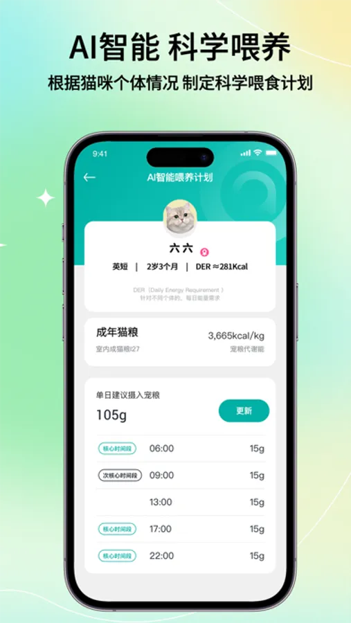 App内置的AI智能喂养计划:是通过全球动物健康数据模型:包括动物基因数据,动物行为数据,及营养数据,为陪伴动物(宠物)提供,更符合动物天性、自然营养需求的采食计划。并纠正一些不良(暴食/异食/挑食…)及错误(一日三餐/一日一餐)的采食习惯。数字化的家庭宠物的行为驯导师和私人营养师。