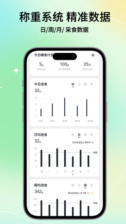 通过宠物食量变化及宠物营养摄入量,辅助判断宠物的身体健康状态。在早期及时察觉某些疾病的潜在可能性。