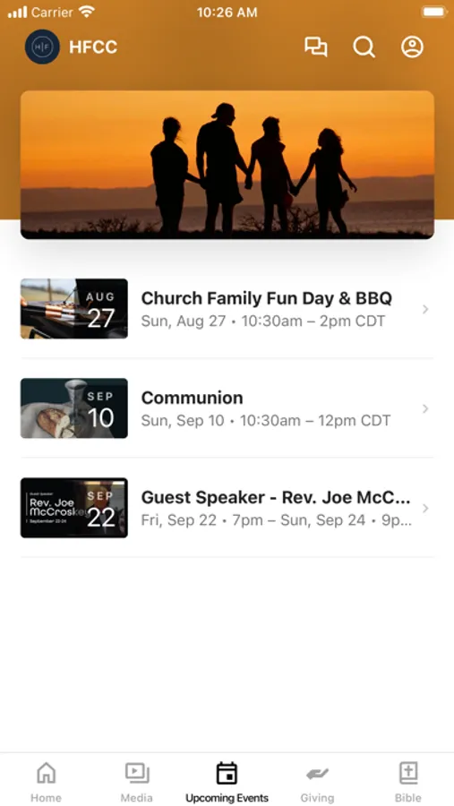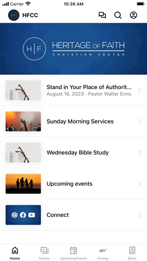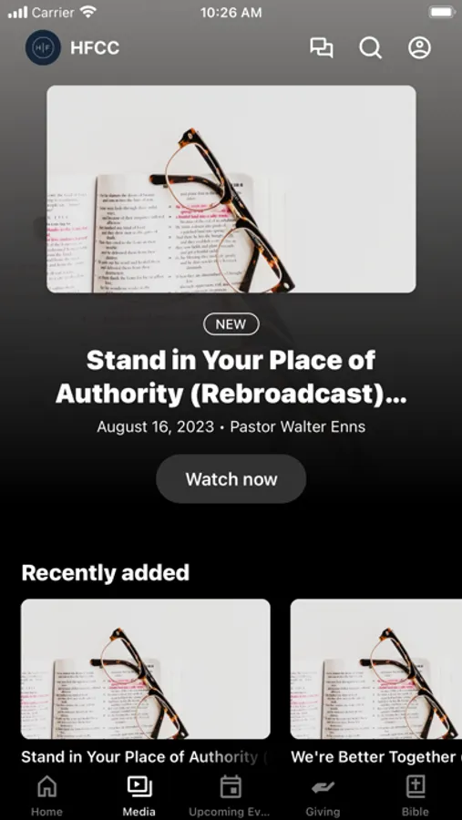 The app features weekly messages by Pastor Walter Enns and other speakers, details about HFCC events, and more.