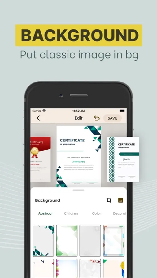 This Certificate Templates & Maker app is an editing tool to customize certificates. The certificate editor gives different options like fonts, colors, text effects, icons, stickers, backgrounds, and signatures.