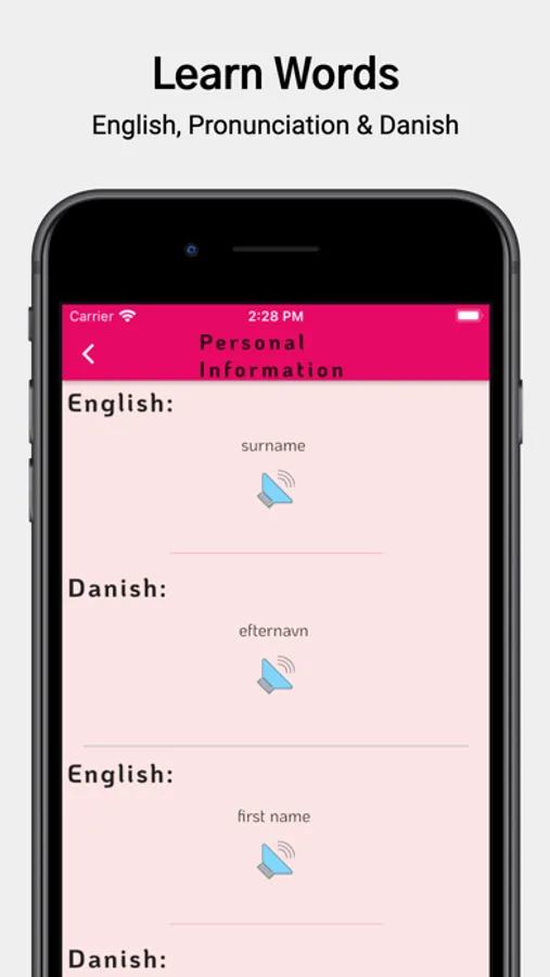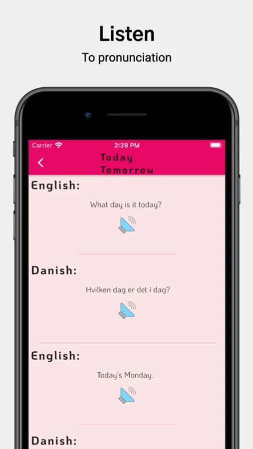 • In every lesson, you can listen to the Danish word pronunciation as well as see Danish word in english language.