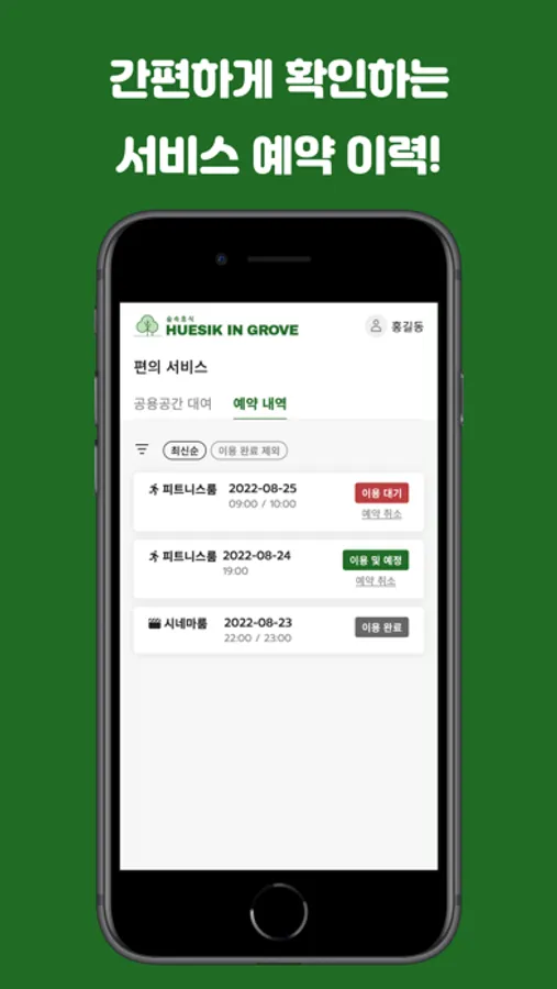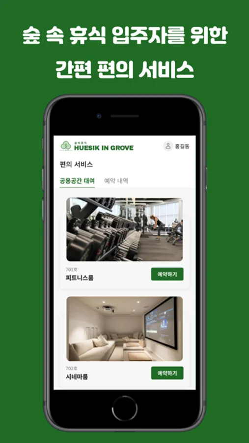오직 숲속휴식 입주자들을 위한 편의서비스(피트니스룸, 시네마룸)을 예약하고 내역을 확인해보세요!