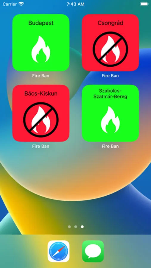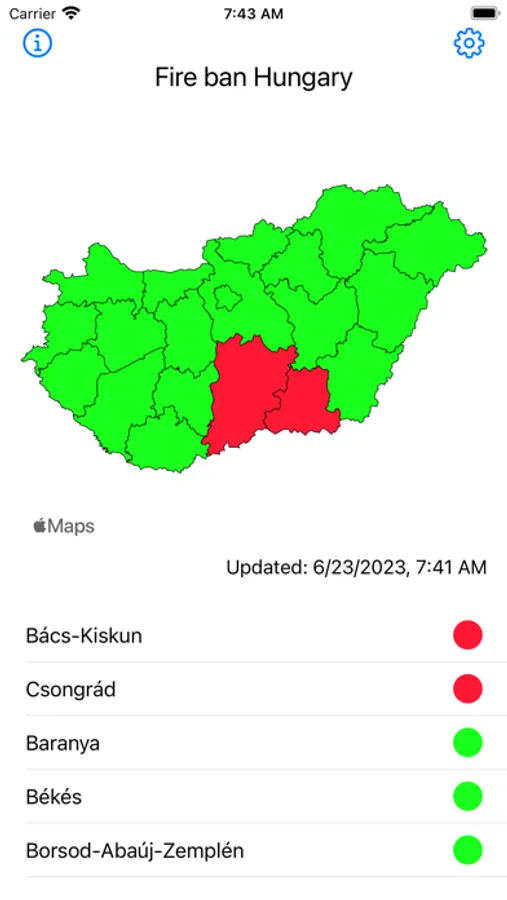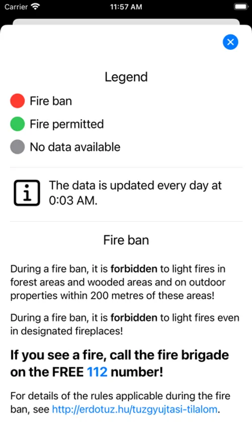 This application provides information on the current fire bans in Hungary. The application displays the current fire ban status in map and list view.