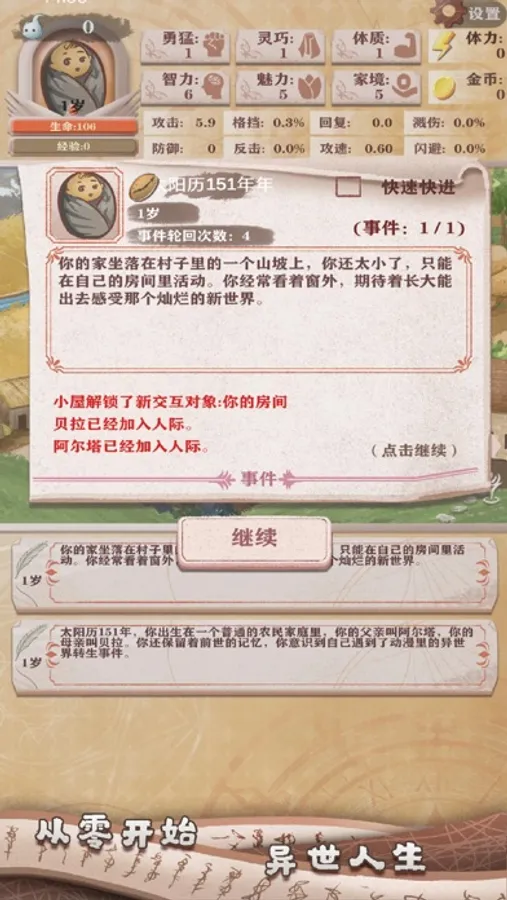 想必去年大家已经玩过很多以角色一生的随机事件为主要内容的游戏了。但是我个人的体会就是大部分游戏只能做到随机,而没能做出事件的连贯性。玩家只能看着一个个割裂的事件蹦出来,而不能以自己的意志影响事件进程。这一点让我自己作为游戏玩家也觉得很不尽兴。