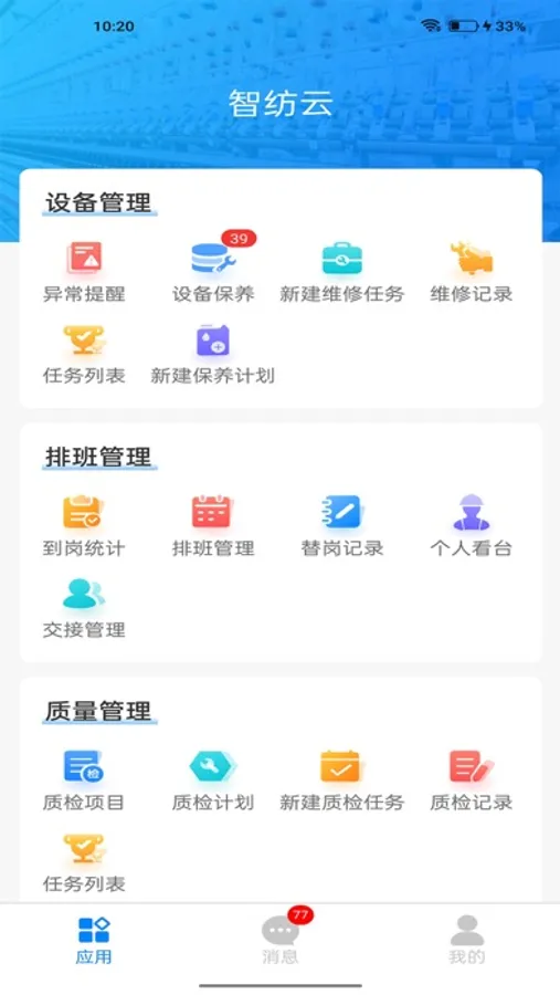 智纺云APP是为纺纱生产企业研发的一款数字化生产管理解决方案。通过公司已有设备研发平台,和物联网等数字化技术,实现企业管理人员和生产一线人员便捷掌握设备运行状态、效率,质量波动,各品种产量等即时性数据,指导企业生产经营,为纱线生产企业提高生产效率,降低生产成本,提升产品质量等价值创造赋能。