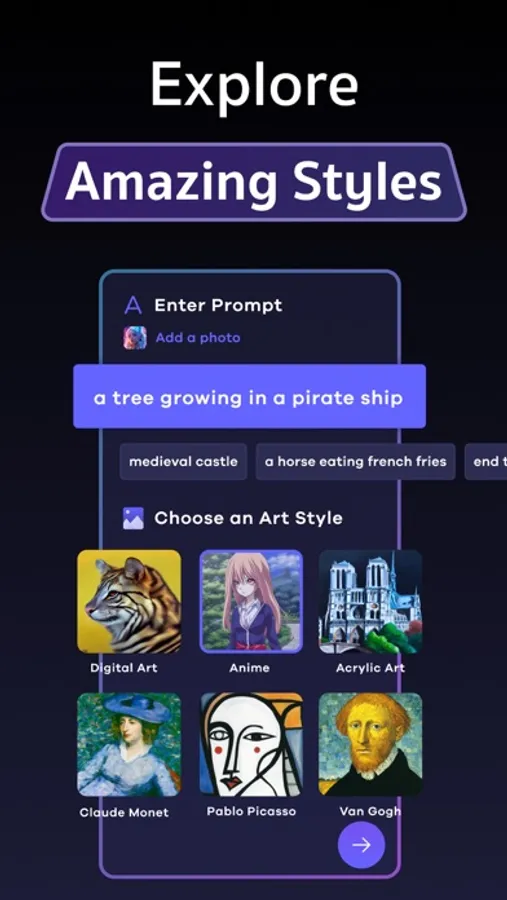 - Diverse Artistic Styles: With over 10 different styles at your fingertips, Airt offers an expansive range of artistic expressions to suit your preferences. Whether you're captivated by the allure of realistic art, the charm of painting styles, the vibrant world of anime, or the timeless elegance of black and white, Airt has something for everyone.