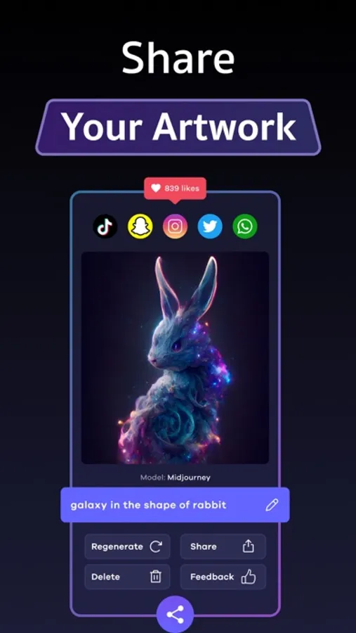 - Share and Inspire: Showcase your artistic prowess with the world! Airt seamlessly integrates with popular social media platforms, allowing you to effortlessly share your creations with friends, family, and followers. Spread the beauty and ignite inspiration among your peers as you become a part of the vibrant Airt community.