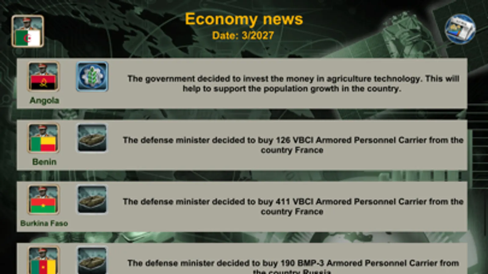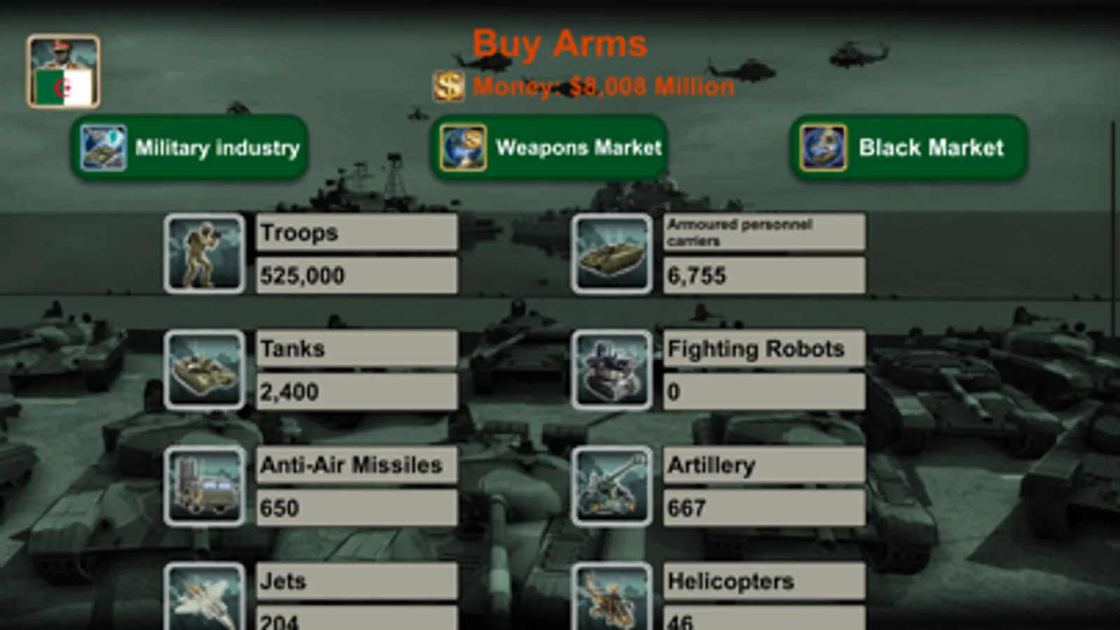 Mercenaries, Armored personnel carrier (APC's), Tanks, Artillery, Anti-Air Missiles, Helicopters, Fighter Jets, Ships, Submarines, Fighting Robots, Unmanned Aerial Vehicles (UAV's), Aircraft Carriers and Ballistic missiles.