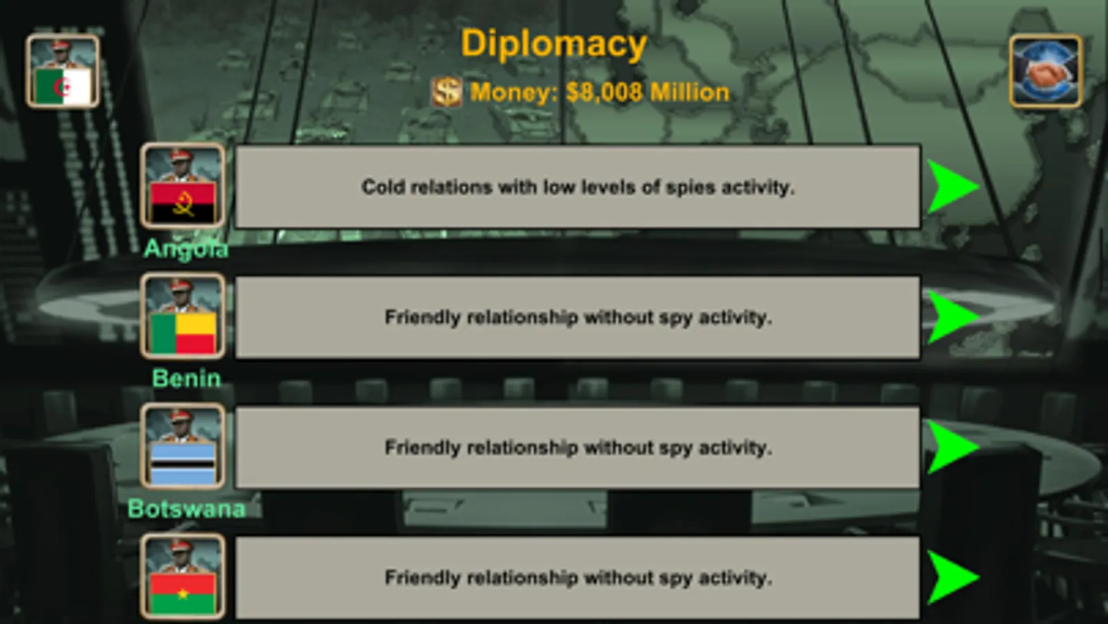 Select your country you wish to lead (54 countries available!) and play against the smart AI enemies. With excellent leadership skills, strategy and tactics, you could lead your country to the win.