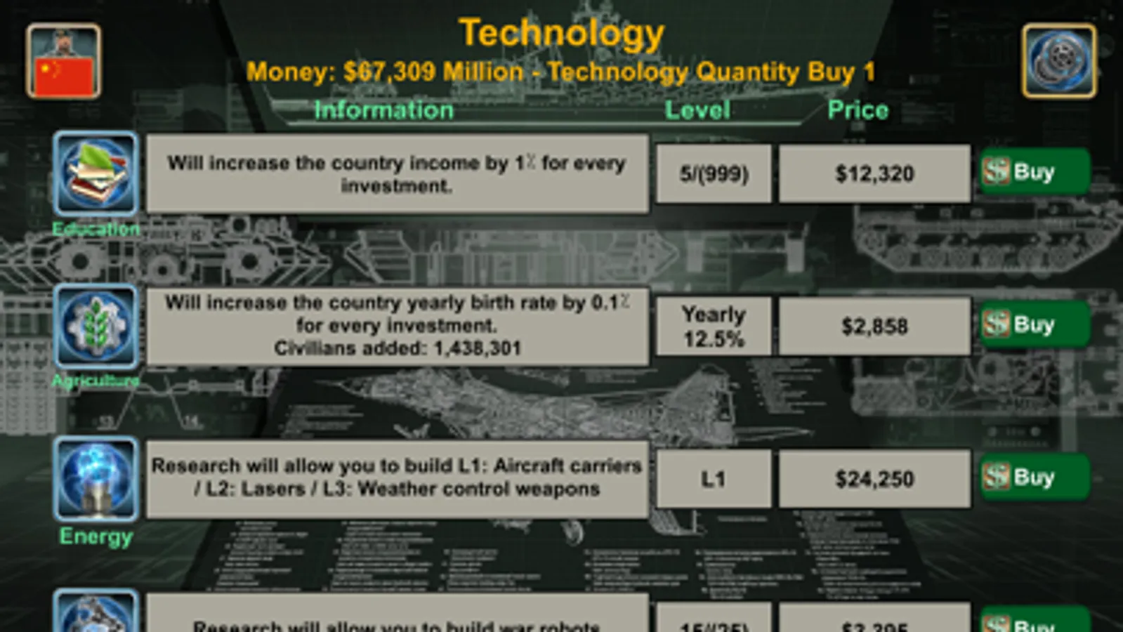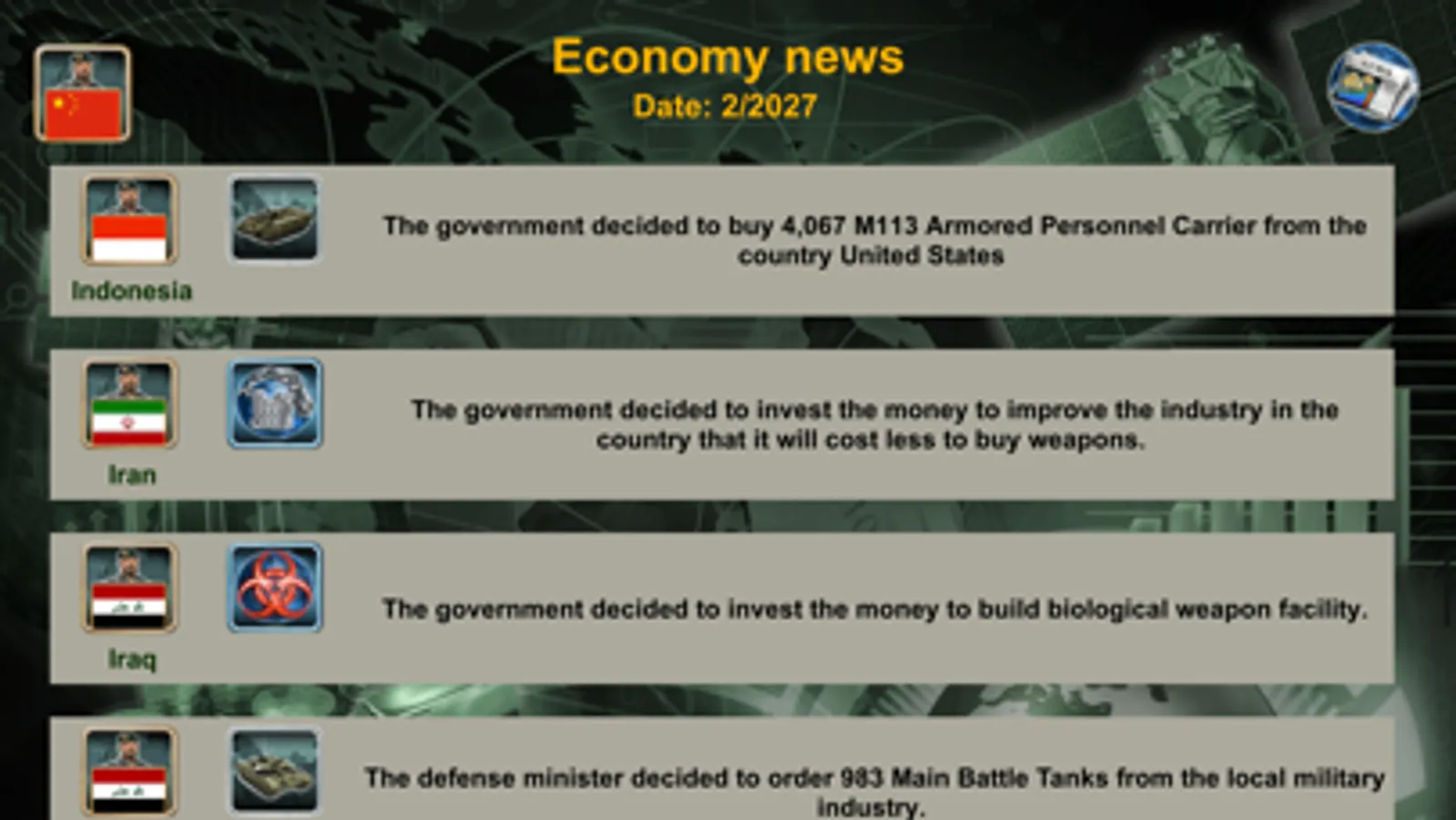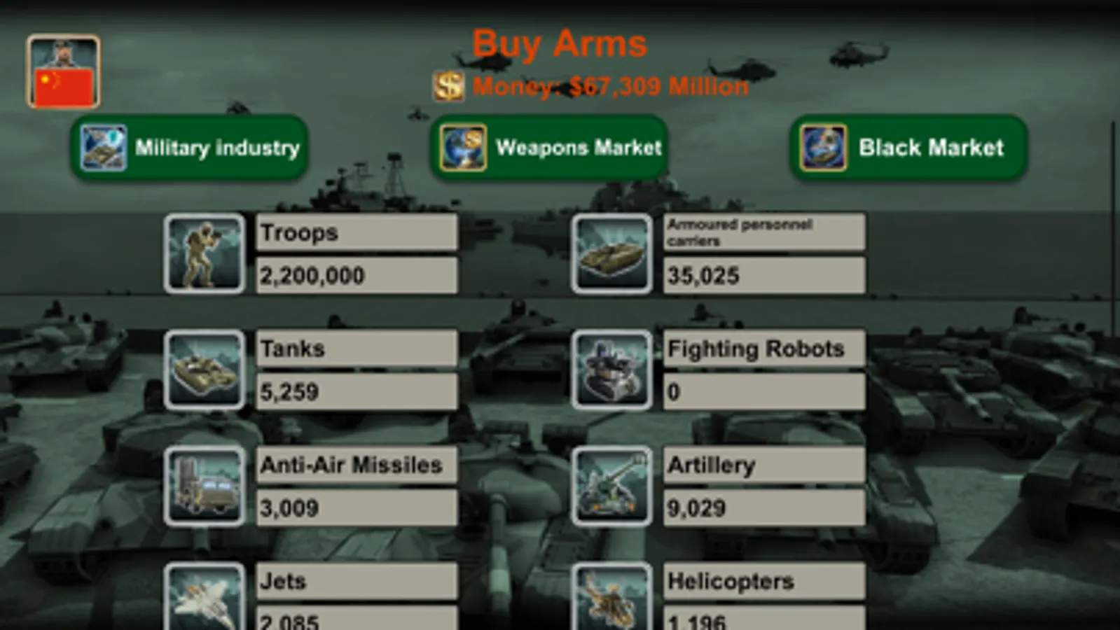 Mercenaries, Armored personnel carrier (APC's), Tanks, Artillery, Anti-Air Missiles, Helicopters, Fighter Jets, Ships, Submarines, Fighting Robots, Unmanned Aerial Vehicles (UAV's), Aircraft Carriers and Ballistic missiles.