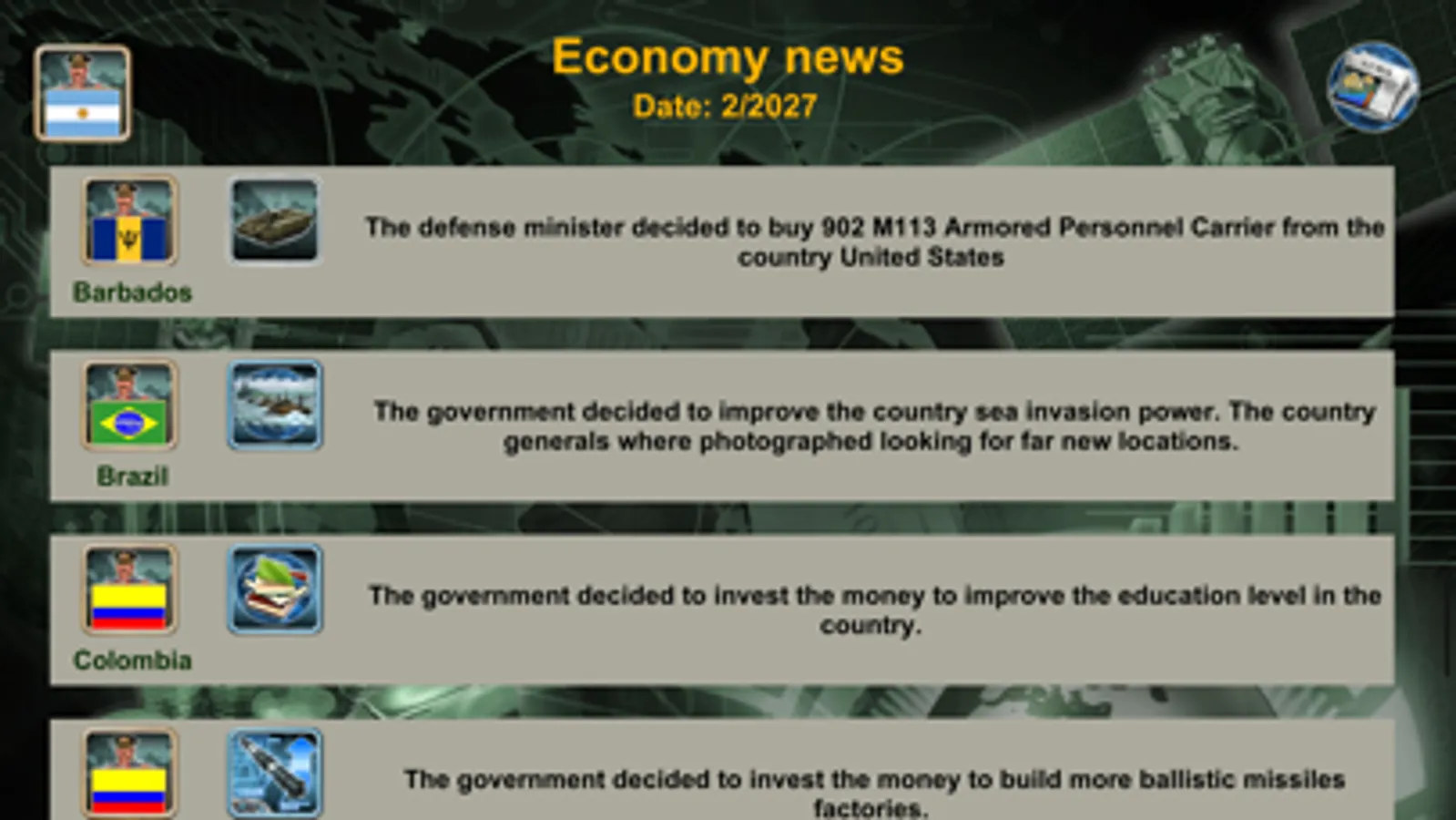 Mercenaries, Armored personnel carrier (APC's), Tanks, Artillery, Anti-Air Missiles, Helicopters, Fighter Jets, Ships, Submarines, Fighting Robots, Unmanned Aerial Vehicles (UAV's), Aircraft Carriers and Ballistic missiles.