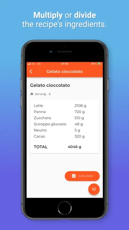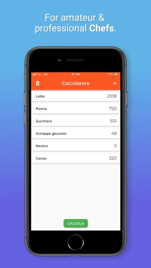 Now, if you need to make an ice cream base with 35% fat cream, but your cream has 37%, knowing that whole milk has about 3.5% fat, you just need to ask Pocket Chef how many grams of milk must be added!